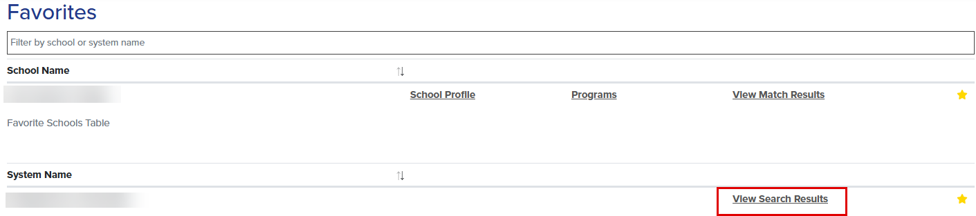 Students can mark schools as Favorites to easily access the institution's School Profile, Program information (if available), and Match results in the future. A state or system can also be added as a Favorite to view search results quickly.