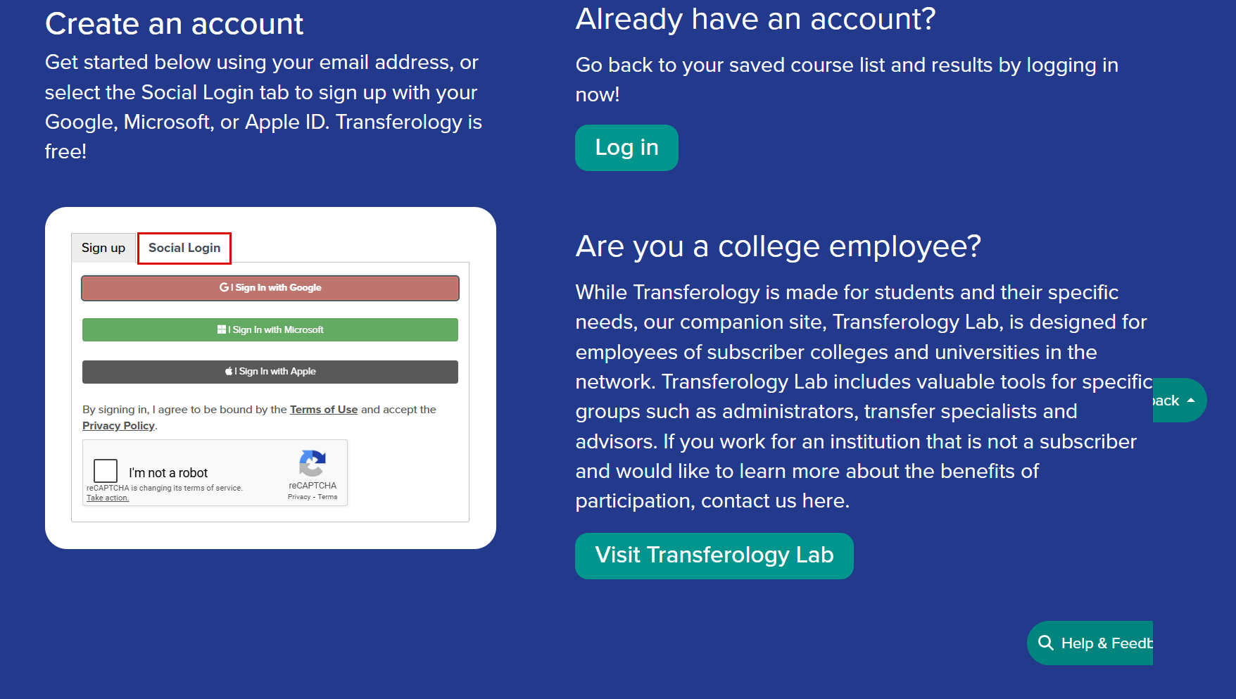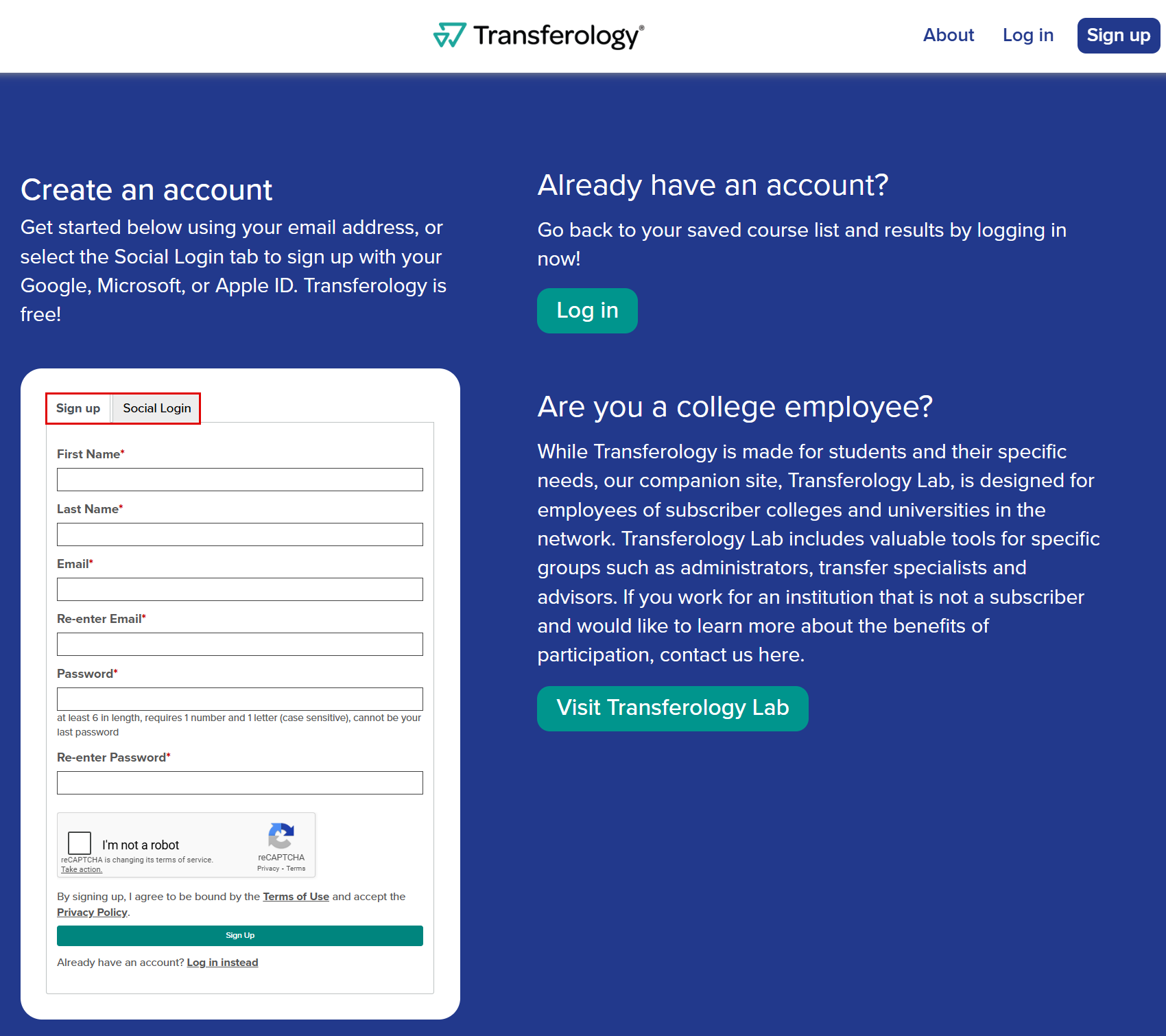 This article provides instructions for creating an account within Transferology®. Transferology is a free tool for students that shows how courses transfer to other colleges or universities within the Transferology network. Students can sign up for an account via email or sign in with a Google, Microsoft, or Apple ID.